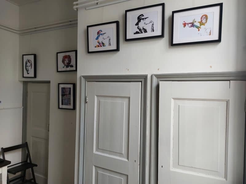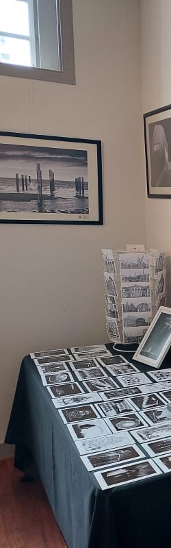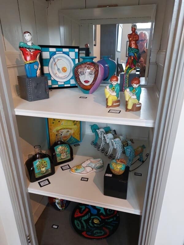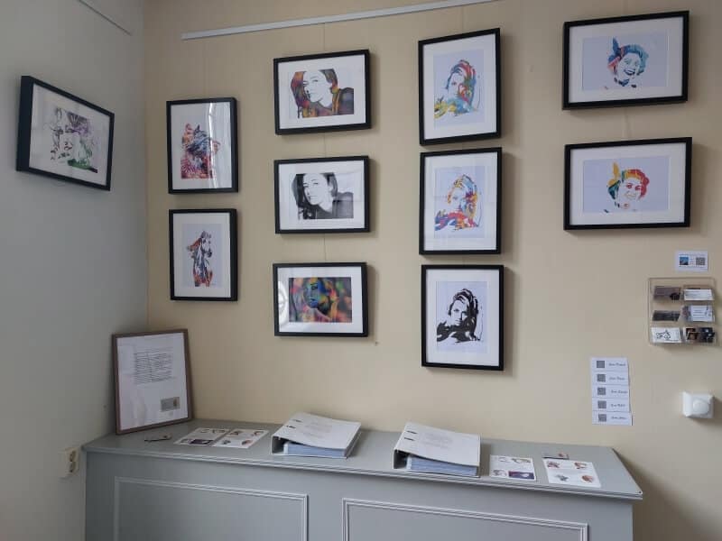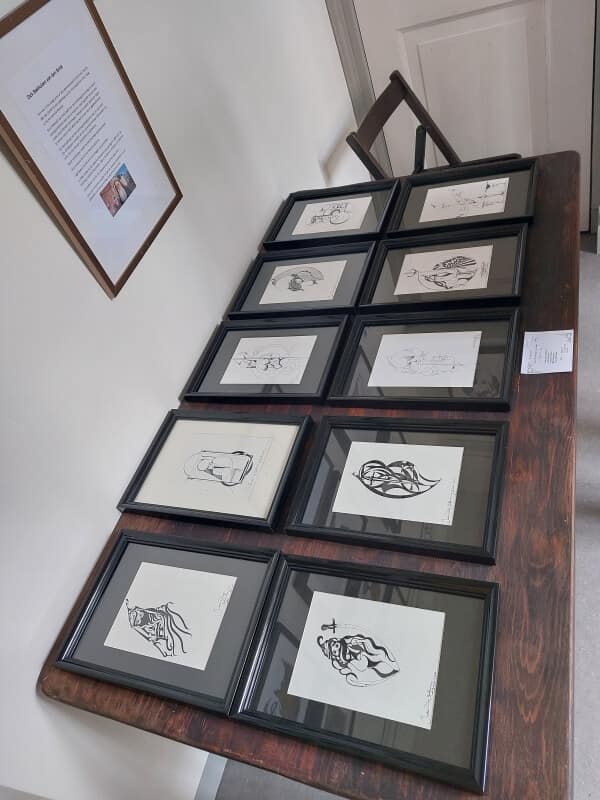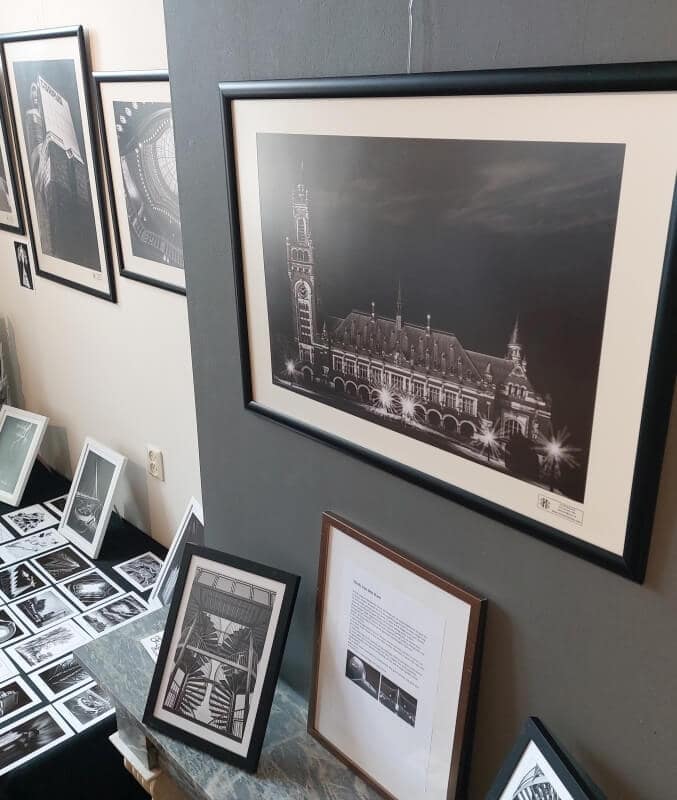 Hennie Ligtrink toont ingelijste afdrukken van met fotoshop bewerkte afbeeldingen: