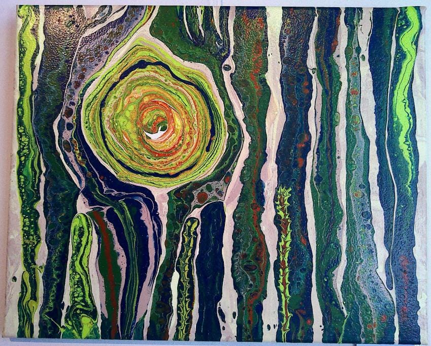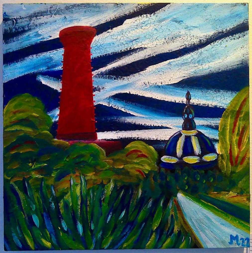 Ook in de badkamer vinden we schilderwerk van Monika Jordense-Michalski. Monika is eigenlijk fotograaf en we zijn dan ook gewend aan haar geëxposeerde foto’s. Maar dit keer toont Monika haar kleurrijke schilderkunst. Het is acryl op canvas.