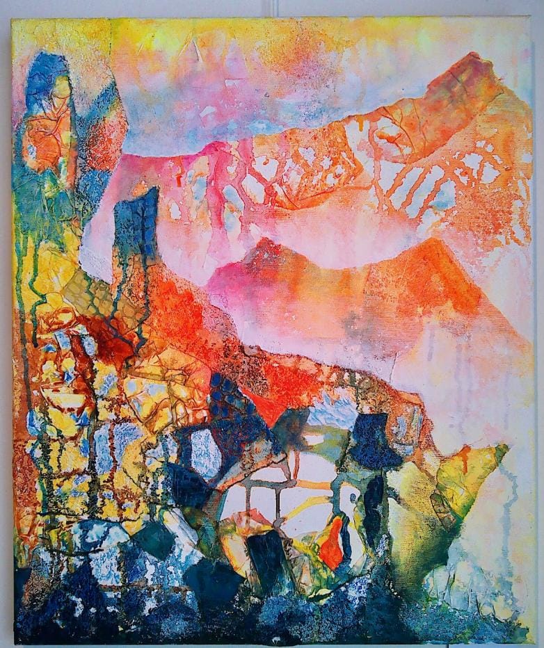 Verder naar achteren zien we werken van Driekske Bakker. Zij gebruikt collagetechnieken in combinaite met acrylverf. Haar liefde voor kleuren is hier goed terug te zien.
