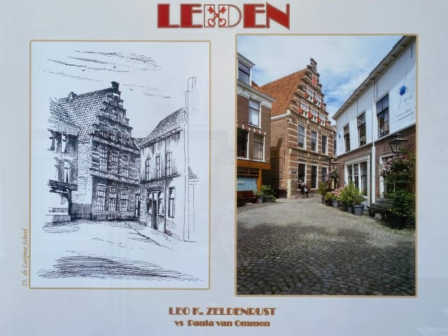 De tentoonstelling bestaat uit posters van tekeningen uit het boekje “wandelen door oud Leiden” gemaakt in de dertiger jaren naast een recente foto gemaakt door amateurfotografe Paula Ommen.