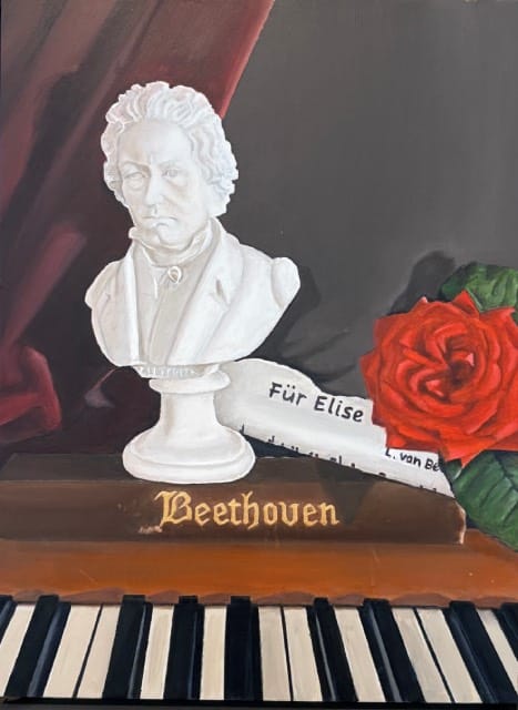 Deze expositie is weer een thema-expositie en hierbij kunnen alle kunstenaars mee doen. Het thema is “muziek in de kunst” en er doen dit keer 18 kunstenaars mee. de muziek is op heel verschillende manieren terug te zien in het werk. Zo zijn er bekende muzikanten uitgebeeld (M. Bakker) en is er bijvoorbeeld op muziek geschilderd (Olga Dorrestijn) of is het interieur van een thuis met muziek uitgebeeld, zingende beelden met een fluitend vogeltje op het hoofd (Sylvia Nieuwenburg).