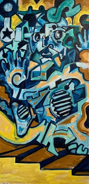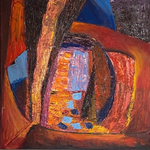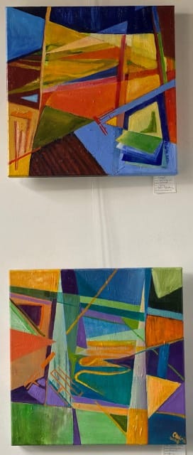 Abstracte Landschappen: Van huis uit is Cherie Achterberg een landschapschilder. Haar onderwerpen liggen dicht bij huis. Sinds vijf jaar woon zij weer in de Randstad. Ze ervaar hier het stedelijk en natuurlijk landschap op een andere manier. Ze is zich bewust geworden van de maakbaarheid van de delta, waarin wij wonen en leven. Wij proberen al eeuwen het landschap aan te passen aan onze behoeften en zo de natuur naar onze hand te zetten. Een proces dat nooit zal stoppen. Haar werk vertaalt dit proces in een gelaagdheid van vlakken en lijnen. Die zowel het stedelijk als het landschappelijk gebied beheersen. Met hier en daar een meanderende lijn die zich niet laat vormen door de mens.