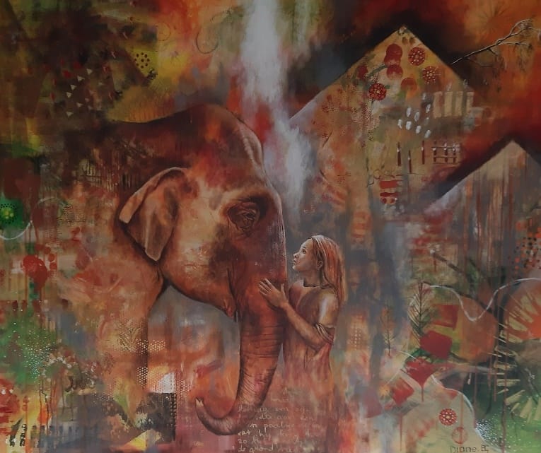 Diane heeft in de kapsalon prachtige schilderijen waarop de mens en relatie mens – dier afgebeeld staan. In de gang heeft zij liefdevol werk met de sluiertechniek.