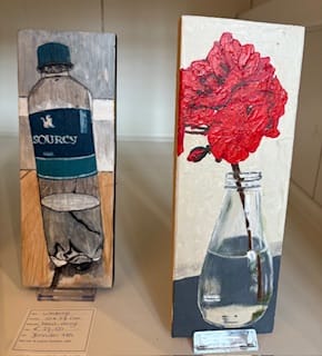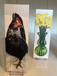 De ‘ik schilder wat ik zie’ serie is geschilderd op hout dat bestemd was voor de vuurkorf. Gelukkig kon ik het materiaal hergebruiken. Vanwege ziekte was ik aan huis gekluisterd en heb geschilderd wat ik zag: een vaas met narcissen, een glas met geraniums, mijn zwarte kip en en flesje water dat door de richel in de tafel scheef stond. Gewoon wat observaties die mij boeiden en hopelijk de kijkers ook..