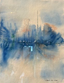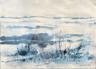 Corien de Kler exposeert drie aquarellen van landschappen. De drager is handgeschept papier uit een middeleeuws fabriekje in Frankrijk. Dit papier wordt nog steeds gebruikt voor officiële documenten. Omdat er geen lijm in het papier is verwerkt zie je dat de aquarelverf heel mooi uit blijft lopen, dit maakt een spannend beeld. “soms is de volgende dag pas duidelijk hoe het geheel er uit gaat zien .’