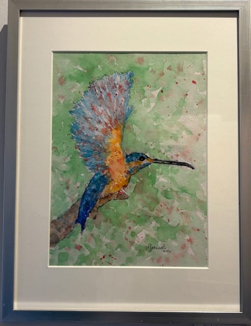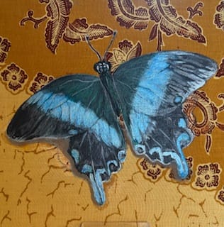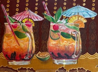 Jennifer Hes Heeft zich toegelegd op twee thema’s: Terug naar mijn roots en ik schilder wat ik zie. De ‘Terug naar mijn roots” is mdf bekleed met batik en beschilderd met een vogel en vlinder uit Indonesië en een cocktail. Ik ontdekte dat Indonesië voor mij meer een vakantieland is ( vandaar de cocktail ) dan het land van mijn voorouders. Ze kwamen uit Nederlands-Indië en dat bestaat niet meer. Mijn roots zijn hier in mijn familie.