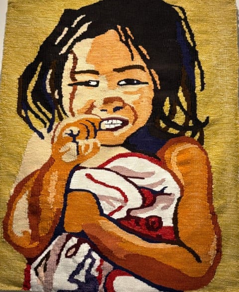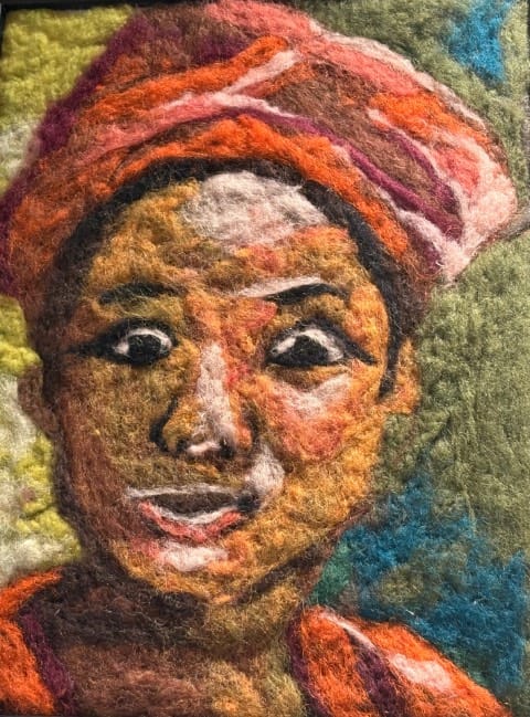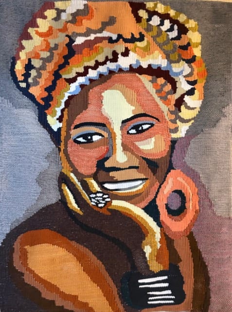 Celine Michel: haar inspiratiebron is Afrika, haar rijke cultuur en de vrolijke levensuitingen van de mensen. Als kind is zij daar opgegroeid en het geeft haar warme herinneringen. Dat vertaalt zich in haar werk en hier mag meer aandacht voor gevraagd worden. De huidskleuren en de klederdrachten komen goed tot uitdrukking in haar wegwerken. Figuratieve weefwerken met als basis een zelf gemaakt olieverfschilderij. Hiernaast maakt zij ook viltportretjes op A3 formaat.