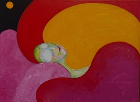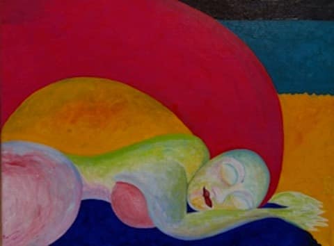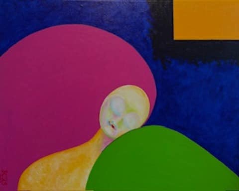 ’s Nachts zijn we eigenlijk allemaal kunstenaars. In onze dromen combineren, vervormen en toveren we de meest unieke creaties. Rivieren veranderen in wegen, we kunnen vliegen en tegelijkertijd zwemmen, dieren wijzen de weg en je oma, die al een tijdje niet meer hier is, verschijnt als een jonge blom ten tonele. Terwijl we in onze nachtelijke cenario’s onze dagelijkse ervaringen en beslommeringen tot gezonde compost verwerken, verrassen we onszelf met bizarre combinaties. Soms kun je er geen chocolade van bakken en soms weet je ineens wat je jezelf aan het vertellen bent. Door deze droombeeldtaal heb ik mij dit keer laten inspireren. De kleuren heb ik vertaald in vijf schilderijen die ik heb meegnomen. De beelden die in het wakkere leven niet bestaan, zoals een onderlijf dat zelfstandig loopt en een zwevende vrouw naast een ballon, heb ik verbeeld in klein werk op papier, in olieverf en potlood.