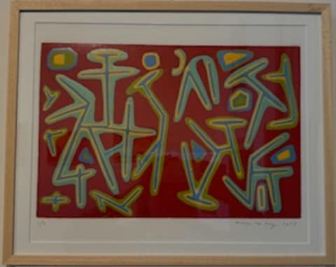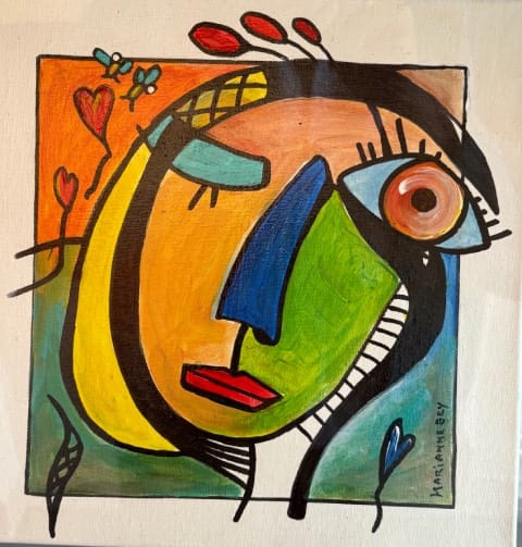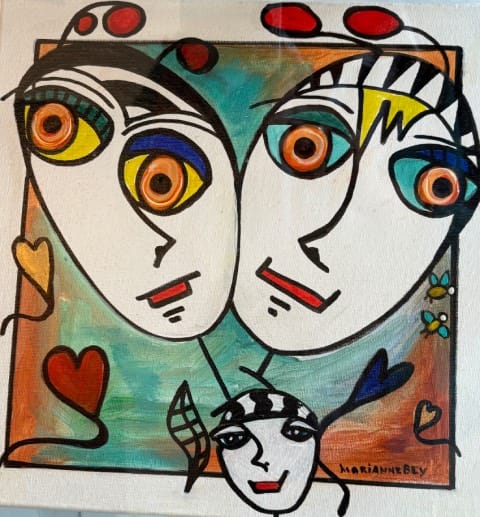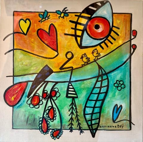 Marianne Beij exposeert vier expressieve werken en laat een lijnenspel zien met een vrolijke gekleurd achtervlak, hierop dansende ogen en gezichten met verschillende motieven. Daarnaast laat ze twee aquarellen van een fruitstilleven zien.