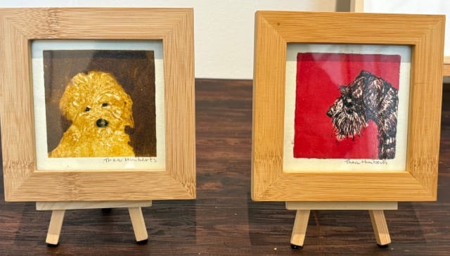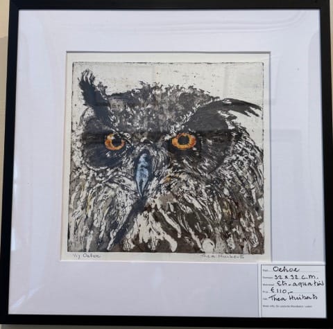 Thea Huiberts heeft voor deze expositie een serie etsen gemaakt van honden (veelal in opdracht van familie en vrienden) en uilen. De uilen zijn een experiment geweest in kleur. Het nachtblauw is een prachtige omlijsting voor een uil! Etsen is een ambachtelijke techniek. De ets gaat in een zuurbak om de lijnen te etsenen daarna in een stuifkast om de kleurvlakken te harsen. De plaat inkt je in, sla je af en druk je af met de etspers. Voor de kleur gebruikt zij meerdere drukgangen.