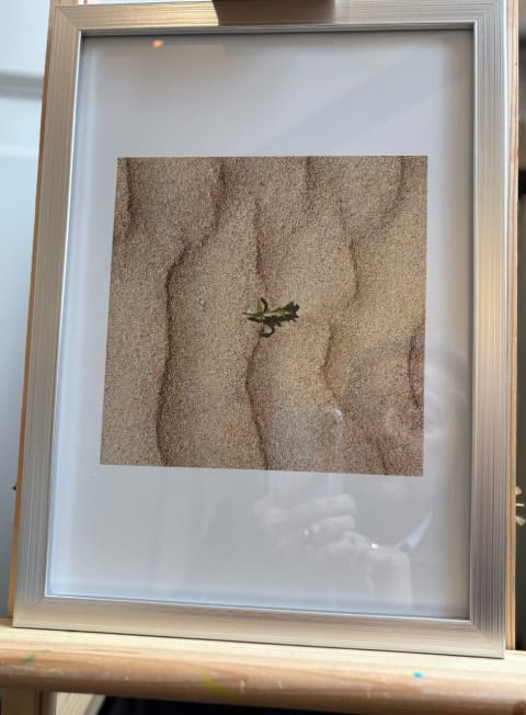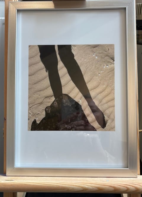 Monika Jordense-Michalski exposeert twee foto’s van een impressie van een mooie zomerdag, het lijnenspel van het zand geeft een grafisch effect met daarop een mooie schaduw van een figuur en op de andere foto een klein teer bloempje.