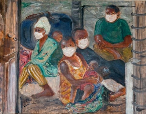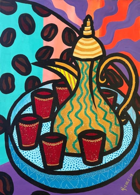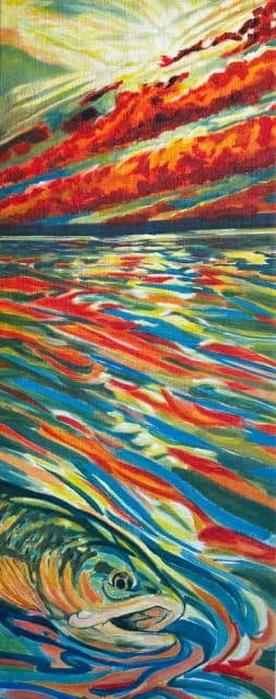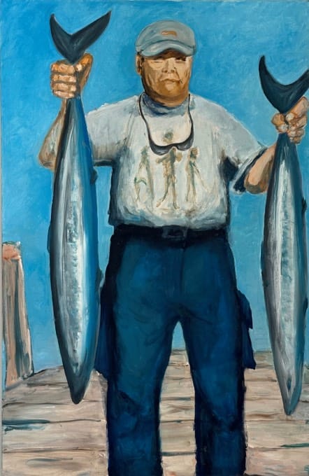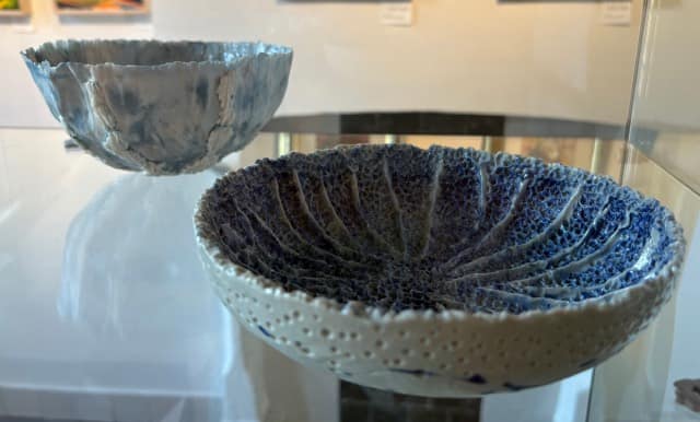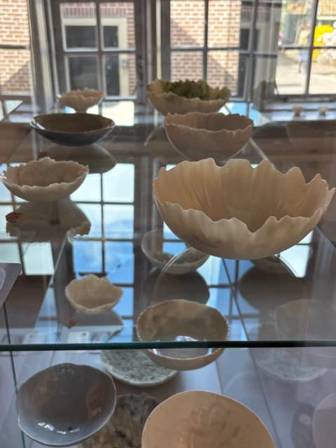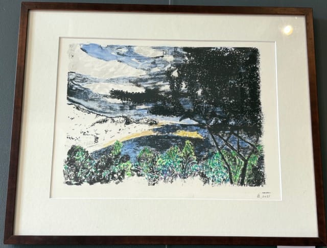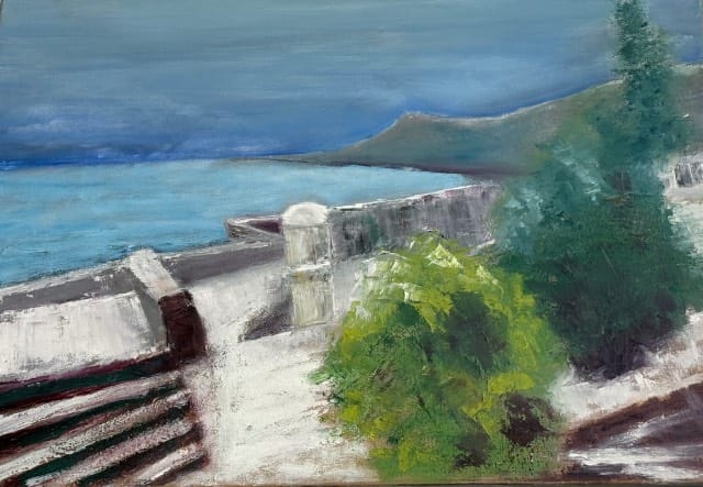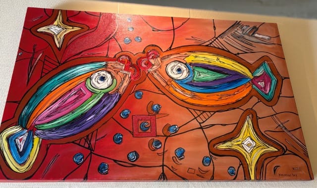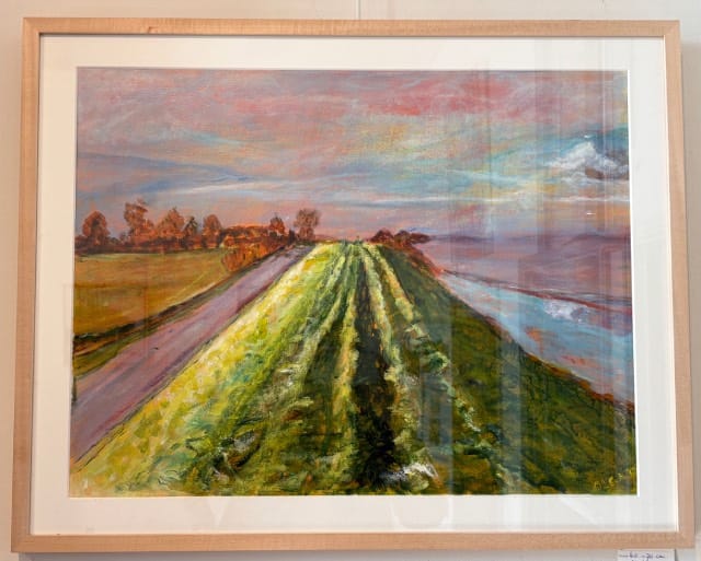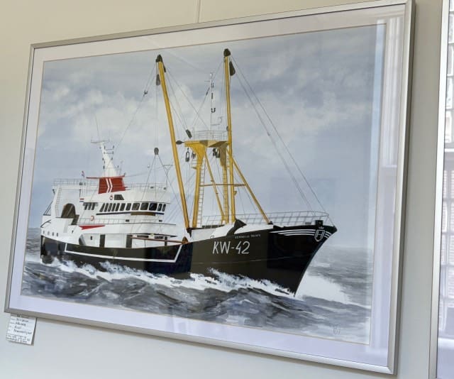 Het is interessant om te zien hoe alle kunstenaars hun eigen draai hebben kunnen geven aan het onderwerp. Het kan een impressie zijn van een vakantie zoals Ineke de Vries heeft afgebeeld op haar schilderijen. Of het kunnen vissersschepen zijn die terugkomen van de vaart, te zien op het werk van Bernard Nijssen. Odette Frijters heeft zich helemaal toegelegd op de het porselein. Het werken met porselein komt tot China, daar werd tijdens de Ming-dynastie voor het eerst eierschaal porselein vervaardigd. Het materiaal is zo delicaat dat het doet denken aan eierschalen. Lies Vester heeft boot vluchtelingen afgebeeld aan de hand van een afbeelding uit het nieuws. Gert Versluis laat de buit van een visser zien. Corien de Kler heeft mooie Chinese dames verbeeld en heeft met een gelplaat de begin afbeelding afgedrukt en beschilderd met acrylverf, met een glazen pen de gouden details aangebracht. Er zijn verschillende buitenlandse landschappen te zien, Olga Dorrestijn. Paneeltjes met ogen van exotische dieren, een paneel met exotische vissen, Marianne Beij. Eric Kerkvliet heeft een landschap met perspectief geschilderd en waar je je in buitenlandse oorden waant. Silvia Nieuwenburg heeft sculpturen met dieren met een cartoonachtige inslag gemaakt, die zich per ballon kunnen verplaatsen. En er is nog veel meer te zien. Laat je verrassen door de diversiteit van deze expositie! (klik op de foto om de hele afbeelding te zien.)