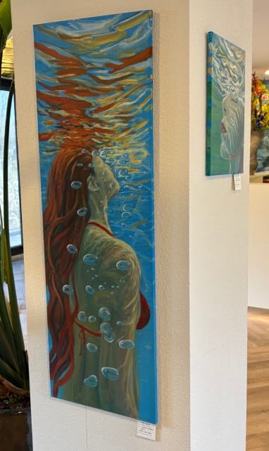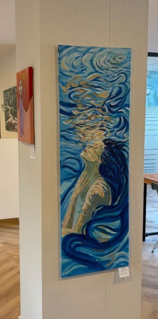 Het schilderij ( rechts op de foto) is een van de ‘op en onderwater’ schilderijen van Corien de Kler. Bij haar schilderijen is te zien hoe iedereen op zijn eigen manier van water kan genieten. In de gang naar de behandelkamers is een serie schilderijen van bomen te zien. Ook hierbij is het materiaalgebruik acryl op doek.