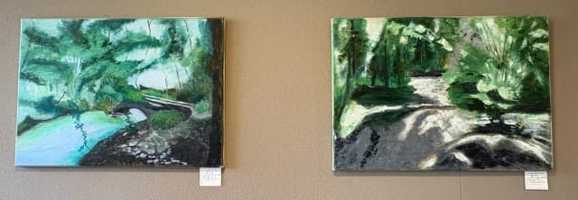Ineke de Vries exposeert een aantal schilderijen waarin zij de Leidse Hout heeft afgebeeld. Zij heeft zich hierbij gericht op de zachte kleuren en de mooie lichtval die in het bos te zien zijn. Het materiaal wat ze gebruikt heeft is acrylverf op doek.