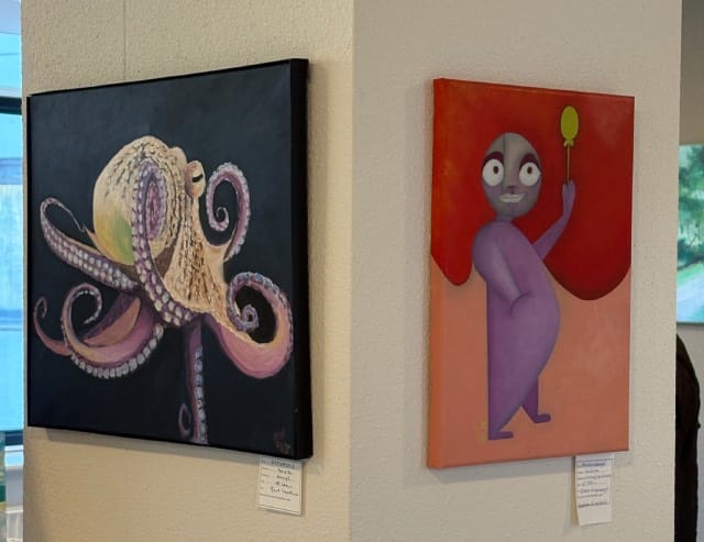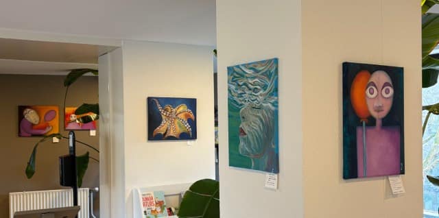 Gert Versluis exposeert en aantal schilderijen van octopussen met een mysterieuze donkere achtergrond. Ook hierbij is het materiaal acrylverf op doek.