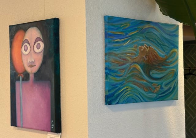 De schilderijen van Irene Kurpershoek ( links op de foto ) zijn te herkennen aan haar eigen stijl. Ze gebruikt felle vrolijke kleuren bij haar geabstraheerde figuurtje met grote ogen. Het materiaal gebruik is acryl op doek.