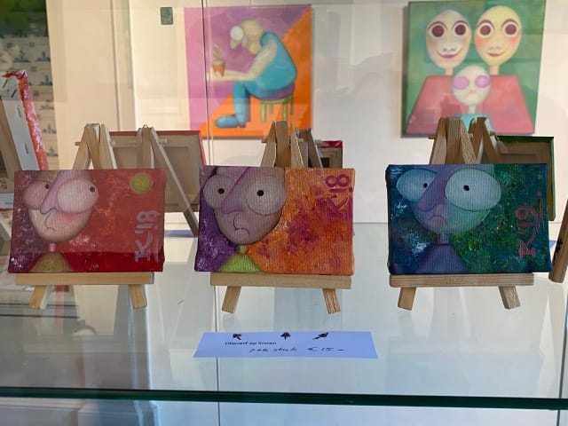 In de vitrine zijn minischilderijtjes te zien die bijna minimalistisch zijn. Irene exposeert nu ook bij Basalt, dus is ze op verschillende plekken te bewonderen.