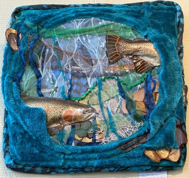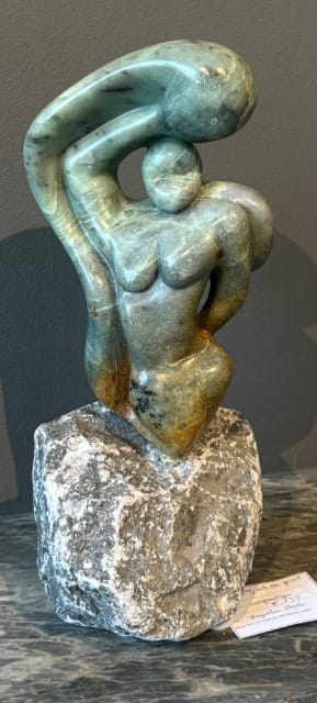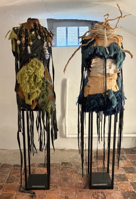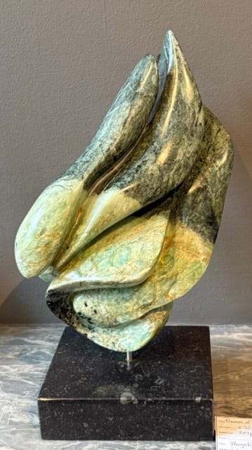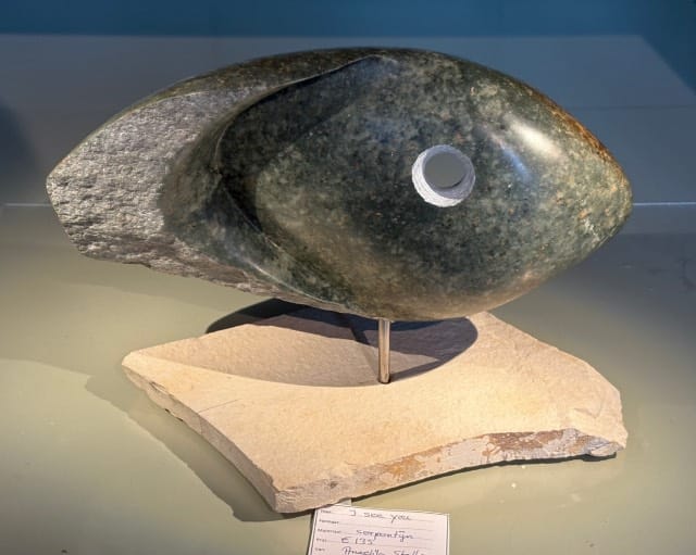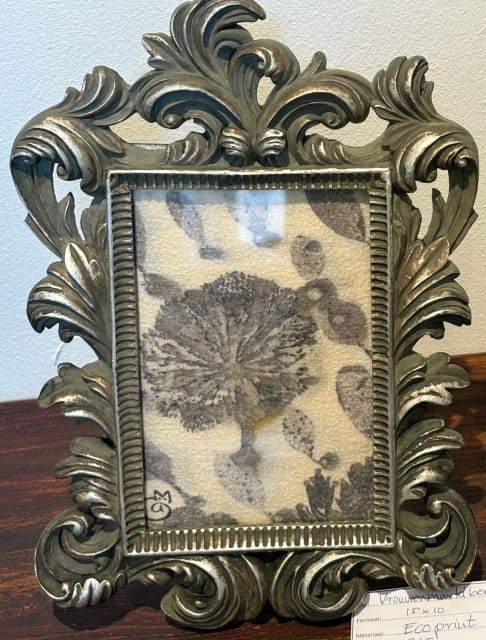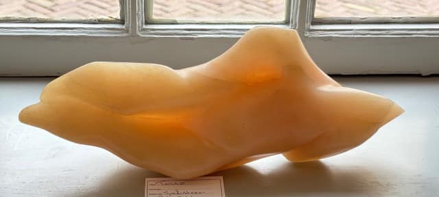 Angelika Stolk: De kunstwerken die tijdens de expositie te zien zijn, zijn ecoprints en beelden van serpentijn. Mijn ECOPRINTS zijn “schilderijen” die ontstaan, door een wonderbaarlijk procedé op eeuwen oude stoffen met alleen natuurlijke middelen en puur botanische verfstoffen van planten uit mijn tuin. Bij de beelden van Serpentijn is mooi het natuurlijke verloop van de kleuren in het gesteente zelf gezien, het maakt deel uit van voorstelling.