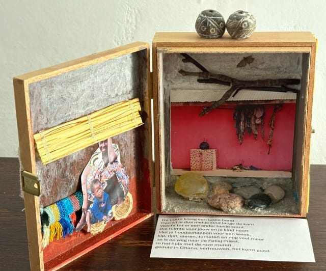 Voor mijn kunst gebruik ik voornamelijk materialen die ik verzamel, krijg of vind, ze komen gewoon op mijn pad! Ook hou ik heel erg van reizen, maak veel foto’s, wandel, fiets geniet van de natuur, bezoek musea, dit zijn mijn inspiratiebronnen voor mijn kunst. De verschillende materialen gebruik ik in mijn werk op een hele andere manier dan waar ze voor bedoeld zijn. Er zit daarom altijd veel variatie in mijn kunst.