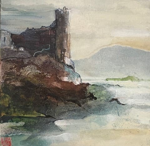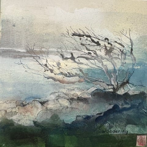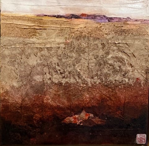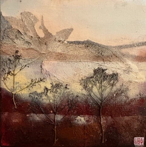 Lida van Wickeren exposeert vier schilderijen, twee blauw en twee bruin getint. Ze werkt heel gelaagd, je kunt allerlei materialen in haar schilderijen ontdekken, van zand tot echte stukken bladeren die weer achter stukken tak verwerkt zijn, hier overheen is weer een laag acrylverf aangebracht. De voorstelling heeft veel weg van oeroude landschappen.