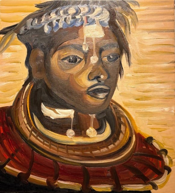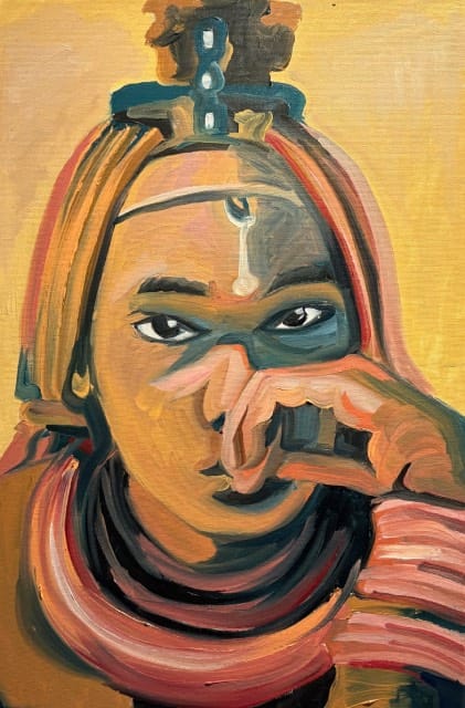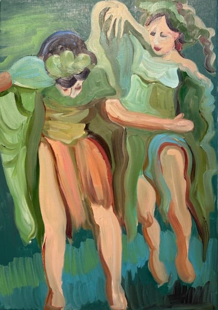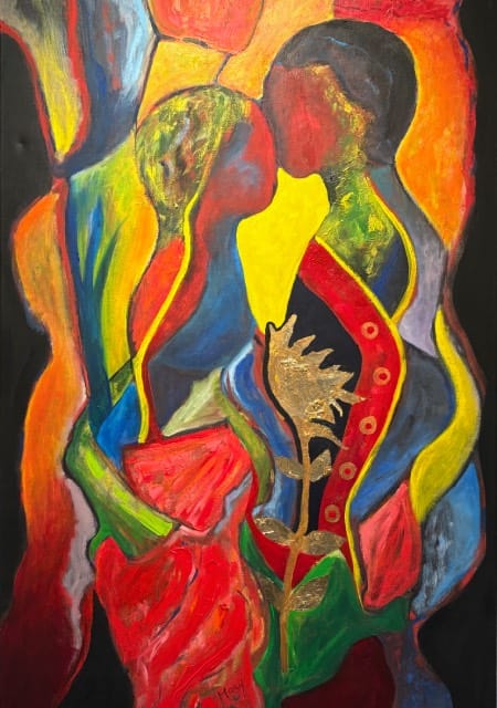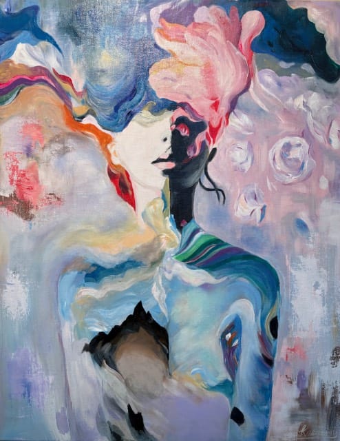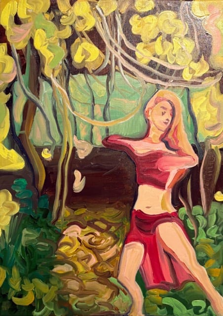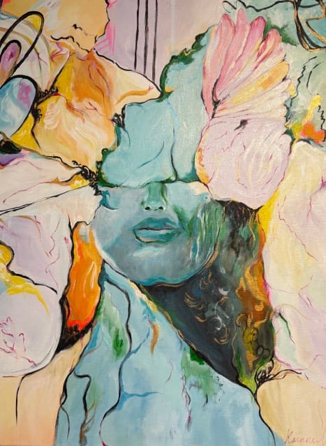 Celine Michel: De werken die ik exposeer zijn nieuw! Ze hebben dit keer twee concepten. Het concept wat ik de laatste twaalf jaar had is vrolijk Afrika. Hiervan zijn nu twee portretten te zien. Omdat ik in september op de academie in Haarlem iets nieuws wilde doen is daar het concept natuurlijk, beweeglijk uit voortgekomen. Vier werken zijn daar nu een verwerking van. Je mag zelf interpreteren wat je er in ziet. De dromerige elfen en dans figuren waren heerlijk om met losse pols te schilderen. Dat is wat ik leuk vind, mijn skills om realistisch te schilderen nu om te zetten in rake toetsen en met grove verfstreken werken geeft mij een nieuwe energie. Hopelijk jullie ook!
