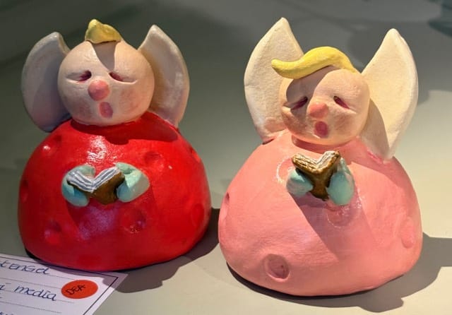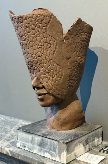 Sylvia Nieuwenburg: Is nu bijna alweer een jaar lid van de Leidsche Mondialen en staat daar vooral bekend om haar werk gemaakt van verschillende ,materialen, met een cartoonachtige uitstraling. Deze expositie heeft ze er voor gekozen naast haar bekende werk/handtekening ook te laten zien dat een deel van haar werk een andere kant heeft.Dus deze keer ook twee grotere werken van klei, gestookt op 1020 graden, verder onbewerkt, omdat zij bij dit werk juist kiest voor de kunst van het weglaten. Vooral goed te zien bij de dame met kap. Juist omdat het compleet het tegenovergestelde is van haar “normale” werk, is het voor haar een uitdaging om dit op te zoeken.