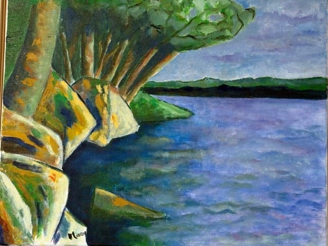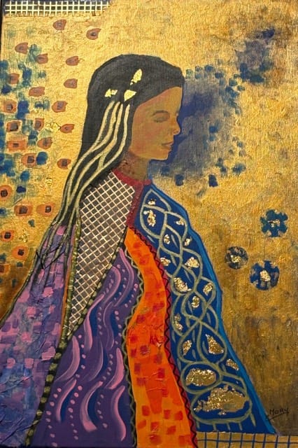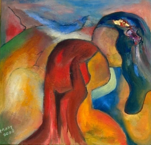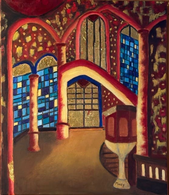 Mary Hendriks: In mijn schilderijen voel ik me altijd aangetrokken tot kleur. Dat heb ik uit mijn periode dat ik in Afrika heb gewerkt. Daar waren de kleuren namelijk overweldigend, die kleuren laten je nooit meer los en die explosie van kleuren pas ik toe in mijn landschappen. Ik ben net in Canada geweest en heb daar weer mezelf kunnen uitleven op de landschappen. Er zijn hiervan twee te zien. Geïnspireerd door Gustave Klimt ben ik ook aan de gang gegaan met bladgoud. Ik heb een paar schilderijen in deze expositie met bladgoud bewerkt. Het is een impressie van de Hooglandsche kerk, ik kreeg een lintje en dat ontroerde me zo dat ik mijn eigen gevoel er in. heb gelegd. Zo kleurrijk is die kerk in het echt niet maar ik beleefde dat wel zo.