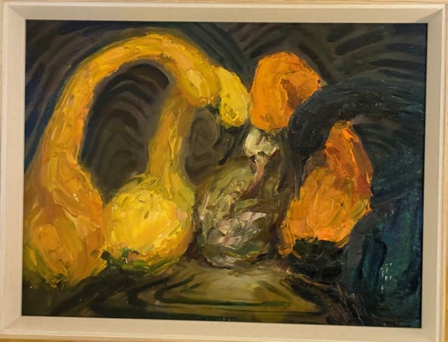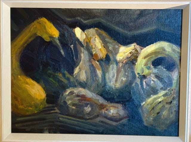 Sanne Bavelaar: Het vierluik ’tis de Natuur: Het vierluik gaat over de vergankelijkheid van het leven. Voor dit werk heb ik gebruik gemaakt van pompoenen. De pompoenen staan hierbij symbool voor ons: de mens. De stillevens zijn geschilderd vanuit de werkelijkheid. 1. De ledenvergadering; De leden zitten in een kring bijeen. Ze bespreken de ouderdom en discussiëren wat ze kunnen doen tegen het ‘ouder worden’. Naar aanleiding van de huidige ’trend’ om het ouder worden tegen te gaan vond ik dit een mooi uitgangspunt om te schilderen. 2. De inspectie; de leden zien onder ogen dat het uiterlijk van enkele leden onderhevig is aan verandering. 3. Het besef; De leden beseffen dat de verandering niet alleen gevolgen heeft voor het uiterlijk. Er is iets onomkeerbaars aan de hand. Het rottingsproces. Het besef is er… 4. Het laatste woord; Er is duidelijk geworden dat de natuur toch het laatste woord heeft. Er valt niet te ontkomen aan het natuurlijk proces.