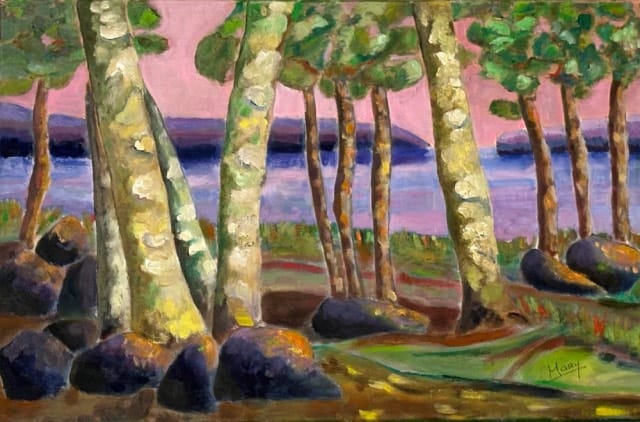 Mary Hendriks: In mijn schilderijen voel ik me altijd aangetrokken tot kleur. Dat heb ik uit mijn periode dat ik in Afrika heb gewerkt. Daar waren de kleuren namelijk overweldigend, die kleuren laten je nooit meer los en die explosie van kleuren pas ik toe in mijn landschappen. Ik ben net in Canada geweest en heb daar weer mezelf kunnen uitleven op de landschappen. Er zijn hiervan twee te zien. Geïnspireerd door Gustave Klimt ben ik ook aan de gang gegaan met bladgoud. Ik heb een paar schilderijen in deze expositie met bladgoud bewerkt. Het is een impressie van de Hooglandsche kerk, ik kreeg een lintje en dat ontroerde me zo dat ik mijn eigen gevoel er in. heb gelegd. Zo kleurrijk is die kerk in het echt niet maar ik beleefde dat wel zo.