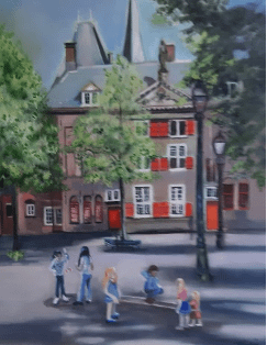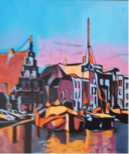 Een deel van de woonkamer is ingericht met acht schilderijen met daarop de Stadstimmerwerf. Fascinerend om te zien hoe iedere kunstenaar zijn eigen interpretatie van dit historische pand heeft gegeven.