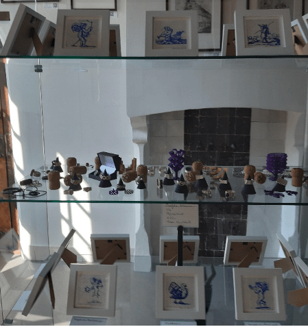 In de vitrine vind je sieraden met een Leids tintje en etsjes met de tegeltjes uit de Stadstimmerwerf.