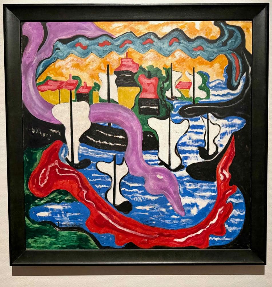 Via het immens grote glasmozaïek van het Algemeen Handelsblad komen we via het pointillisme bij het expressionisme. Werken van Bram van Velde en Jacoba van Heemskerk tonen de ontwikkeling in de stijlen. Na een fraai stukje pianowerk in Dada-stijl komen we dan bij Theo van Doesburg, de grondlegger van De Stijl. Mooi zichtbaar is zijn ontwikkeling met de twee werken die hij maakte van de Blauwpoortsbrug. Om uiteindelijk uit te komen bij de hele specifieke stijl van De Stijl. Els stelde de vraag wat je in het glaswerk herkent in het vierkant linksboven. Alle Mondialen pijnigden hun hersens om uit deze abstractie iets te kunnen opmaken. Onder de afbeeldingen de oplossing.