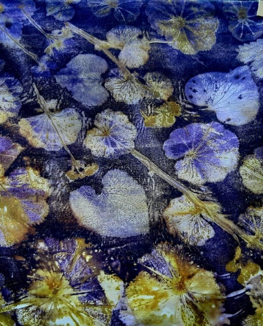 Mijn Ecoprints zijn daar een voorbeeld van. Het zijn “schilderijen” die ontstaan door een wonderbaarlijk procedé op meer dan een eeuw oude stoffen met alleen natuurlijke middelen en puur botanische kleurstoffen van planten en bomen uit mijn tuin en omgeving. Doordat elke plant een vaak onvoorspelbare reactie aangaat met de stof, bestaat mijn werk voornamelijk uit het op mijn wijze rangschikken van het materiaal, de keuze van de plantaardige tannine voor de achtergrondkleur. De rest plantenmagie. De meer dan 100 jaar oude stoffen komen uit de uitzetkist van mijn grootmoeder en worden op deze manier respectvol gerecycled. Mijn weefsels zijn indrukken uit de natuur vertaald en vastgelegd op een weefraam of tussen takken met behulp van kleurrijke wolrestjes en ander natuurlijk materiaal. Mijn sculpturen zijn organische vormen in steen. Soms ontstaat er een abstract en soms een figuurlijk beeld. Dat hangt af van wat er al in de steen zit, breuklijnen, kleuren, vormen. Voor mijn gevoel ga ik hiervoor een dialoog aan met de steen en dat is spannend en ook vol plezierige verrassingen. Onder het motto “Busy hands, quiet mind” wordt er in de zomer in mijn tuin geregeld met een klein groepje aan stenen gewerkt. Nu er meer tijd en ruimte is voor mijn creative ontplooiing ben ik benieuwd waar dit proces van verdieping in de materie mij brengt. Na een succesvolle expositie in Galerie De Pomp in Warmond en gespot te zijn op een kunstmarkt, ben ik blij sinds dit jaar lid te zijn van de Leidsche Mondialen. Email: engelwortel2004@yahoo.co.uk Tel: +31651288264