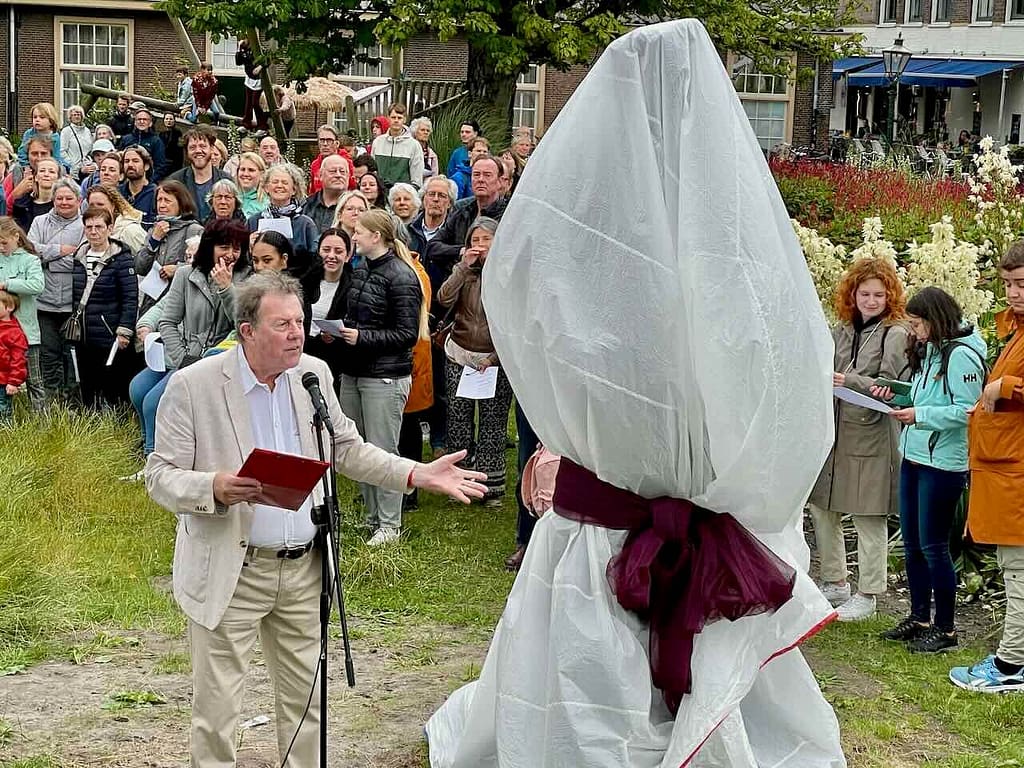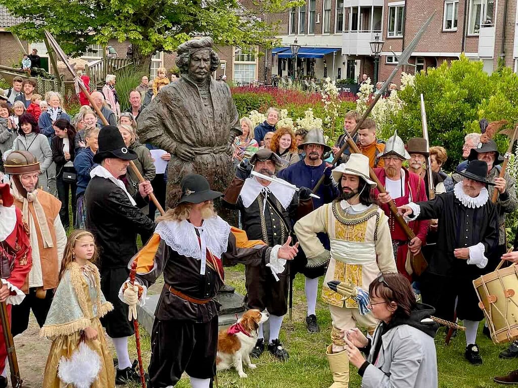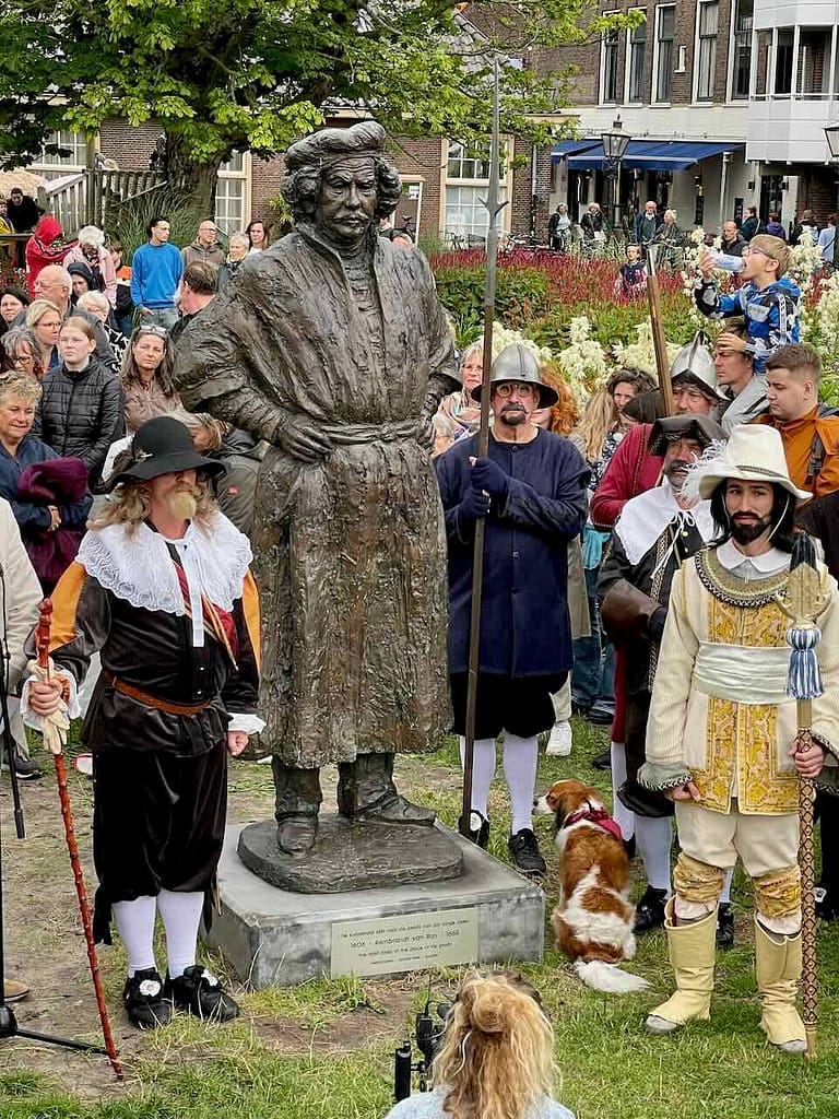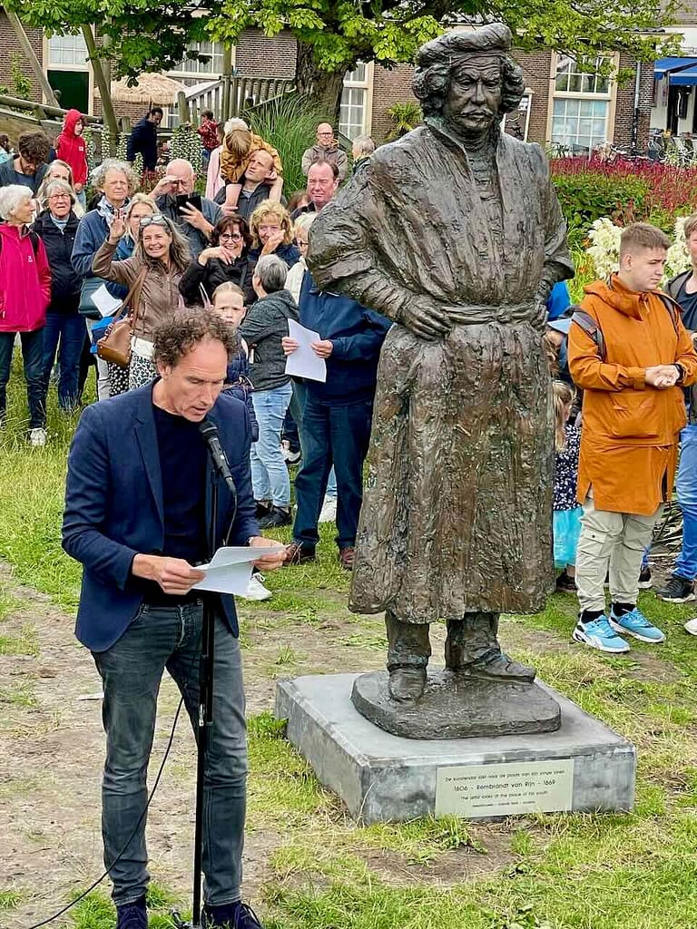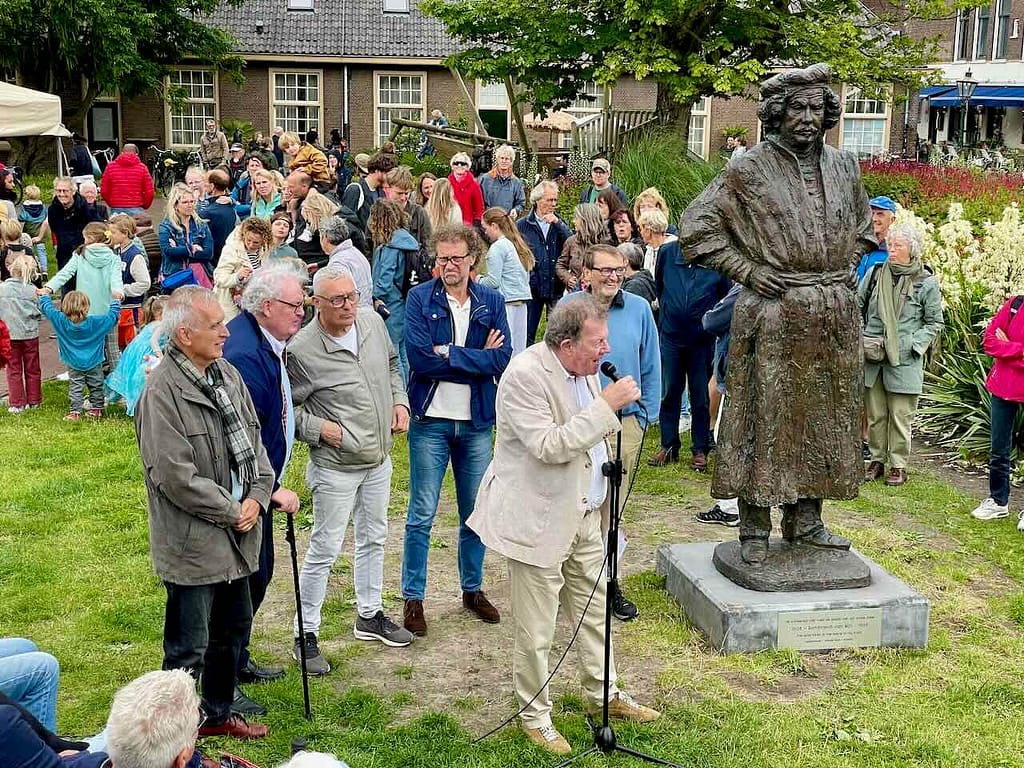 Het beeld werd onthuld door Frans Banninck Cocq, burgemeester van Amsterdam, die als kapitein prominent staat afgebeeld op Rembrandt’s meesterwerk “De Nachtwacht”. Na de onthulling sprak Onno Blom, schrijver van “De jonge Rembrandt”. Hij bestempelde onze stadsgenoot als “een goddelijke verteller in verf”.