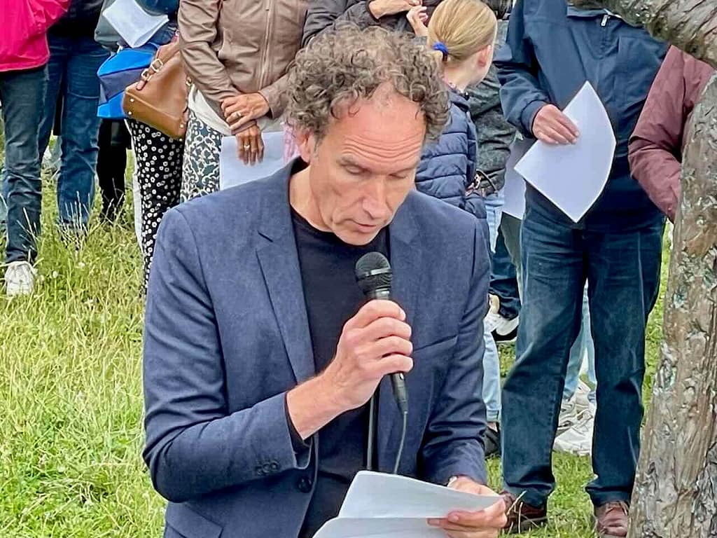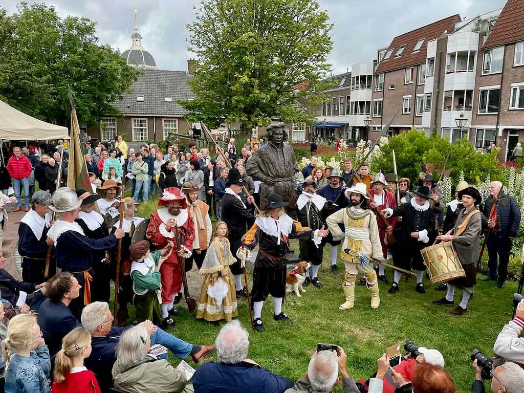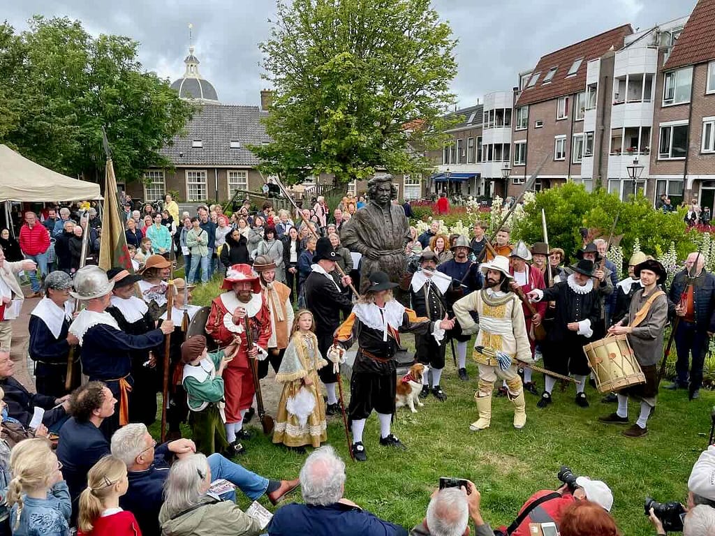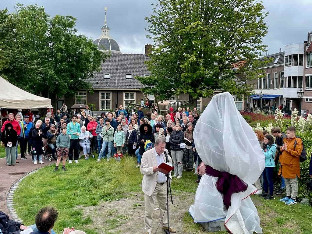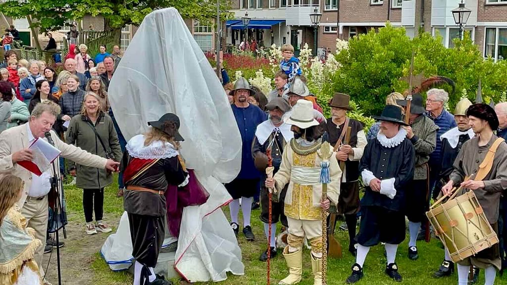 Het beeld werd onthuld door Frans Banninck Cocq, burgemeester van Amsterdam, die als kapitein prominent staat afgebeeld op Rembrandt’s meesterwerk “De Nachtwacht”. Na de onthulling sprak Onno Blom, schrijver van “De jonge Rembrandt”. Hij bestempelde onze stadsgenoot als “een goddelijke verteller in verf”.