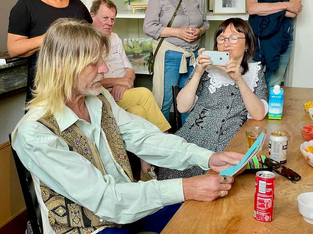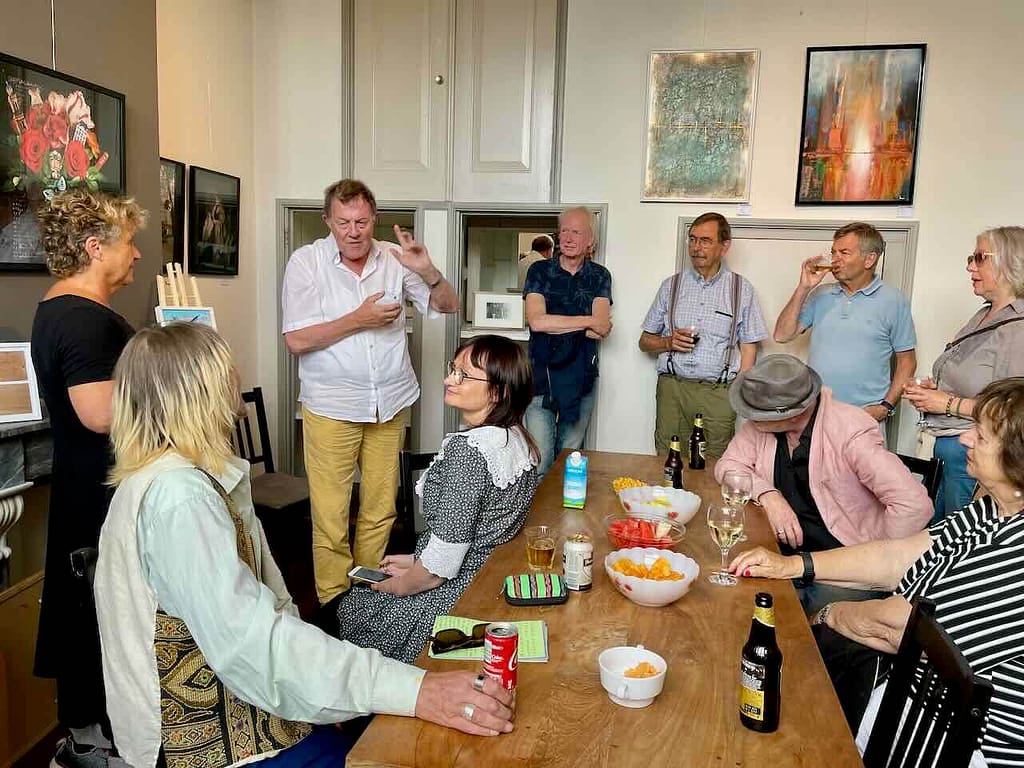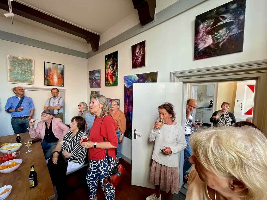 Zoals gebruikelijk werd de opening verricht door Dea Brak, die al snel het woord gaf aan een van de exposerende kunstenaars, Justus Donker. Justus heeft in het kader van de Rembrandtdagen een aantal brieven geschreven aan de beroemde stadgenoot. Hiervan las hij er enkele voor. De antwoorden van Rembrandt blijven verborgen in het archief van Justus.