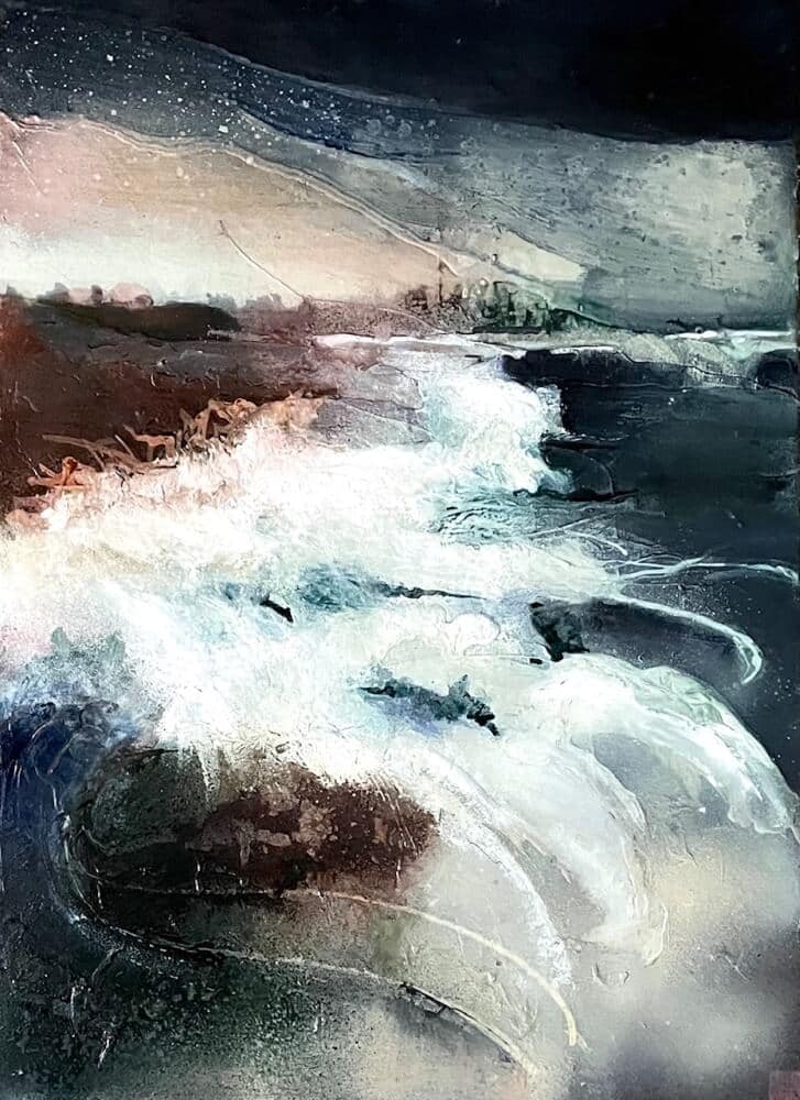Ik gebruik als basis acrylinkt en acrylverf, breng lagen aan en haal ze weer weg.