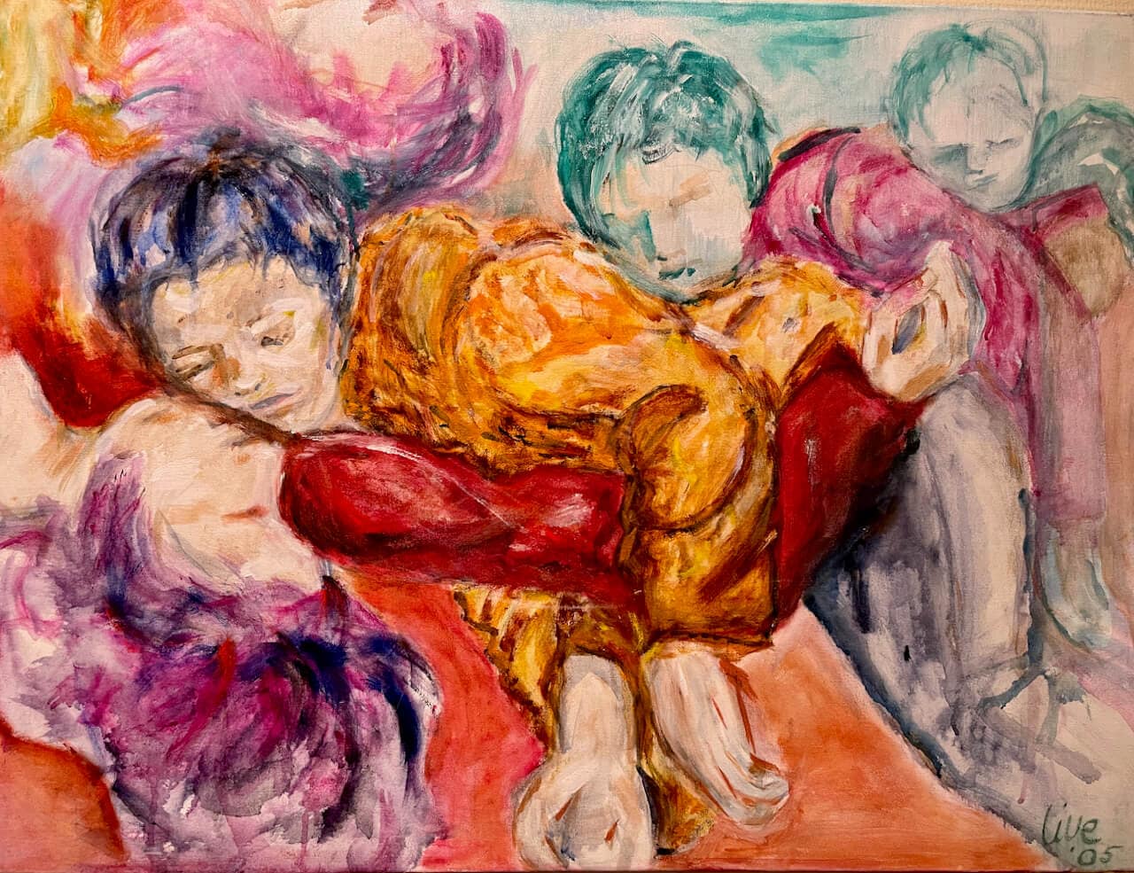 In de hal en de kapsalon hangt werk van Lies Vester. Lies is een ervaren kunstenaar, die schilderijen toont van mensen aan de zelfkant. Haar portretten kijken ons aan met een zekere trotsheid, ondanks de achterliggende misère.