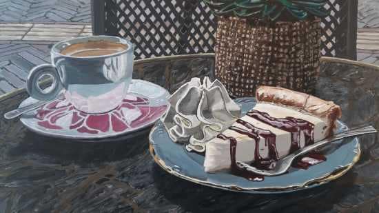 Niels de Ruiter heeft tekenen en schilderen altijd al leuk gevonden maar heeft het pas serieus genomen toen hij naast zijn werk de kunstacademie Leiden – Haarlem is gaan doen. Helaas is het vaak druk op zijn werk en dus blijft het een strijd om tijd en zin te vinden. Ritme is een belangrijk wapen in die strijd. De inspiratie voor zijn laatste vier schilderijen kreeg hij op buitenkunst Drenthe waar hij afgelopen zomer was. De opdracht was gebak te schilderen. Sindsdien doet hij niet anders meer. Hij houdt ook erg van gebak. Nu heeft hij nog meer lol van zijn gebakje op een terrasje ergens want hij kan het ook nog schilderen na afloop. Niels maakt een foto die hij daarna met een beamer projecteert en positioneert op het doek. Daarna trekt hij hem over met houtskool en schildert hij het gebak met de foto als referentie vanaf zijn telefoon. Hij houdt van enigszins krachtig en grof schilderwerk dat van een afstandje toch foto-realistisch lijkt te zijn. Dat kom vooral omdat hij het onderwerp groter schildert dan het in werkelijkheid is.
