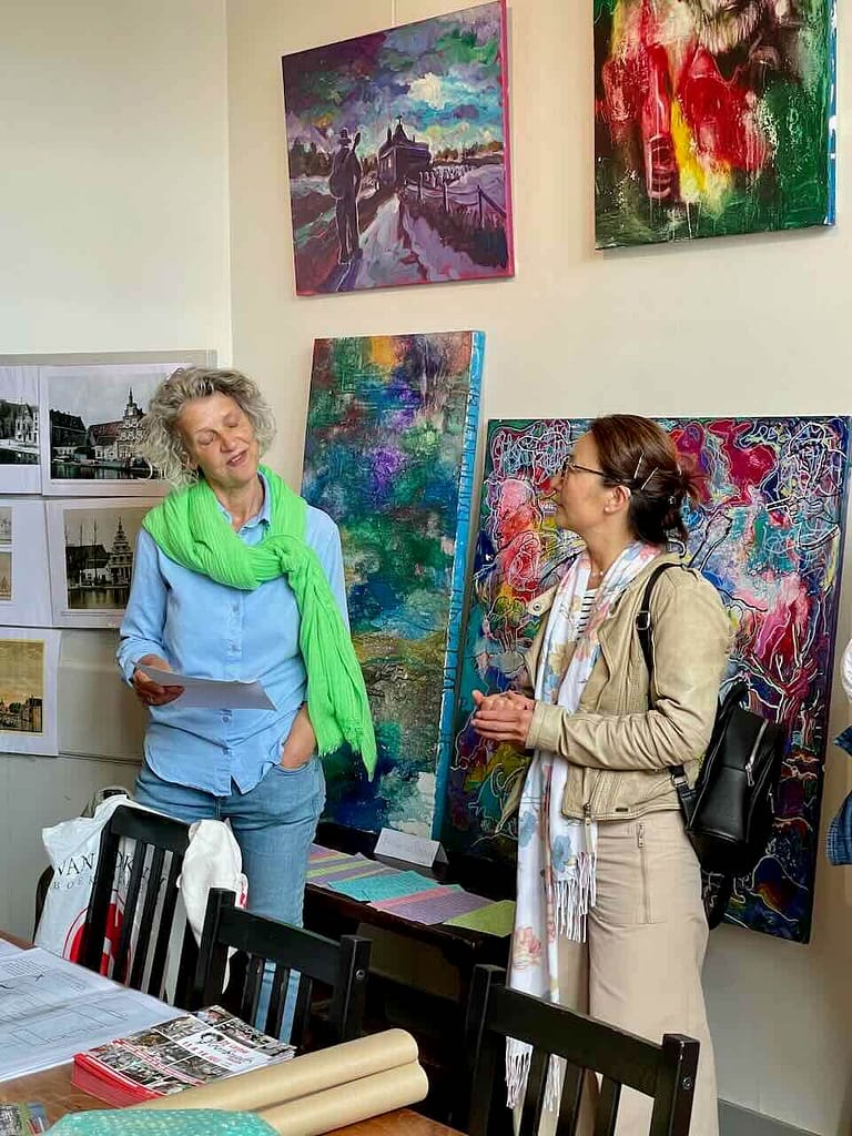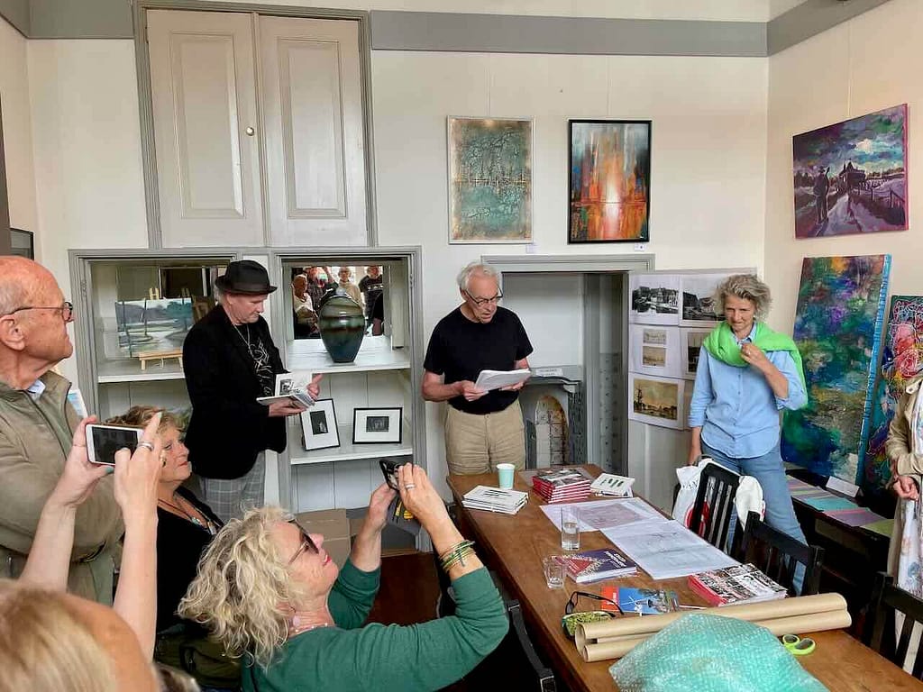 ’s Middags was het tijd voor een rustmoment toen een drietal dichters hun poëzie in de Stadstimmerwerf ten gehore bracht. Een klein maar fijn publiek luisterde geconcentreerd naar een heel andere vorm van kunst dan schilderen.