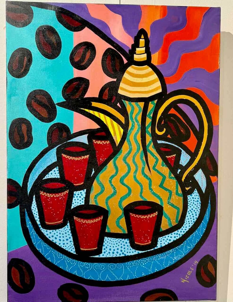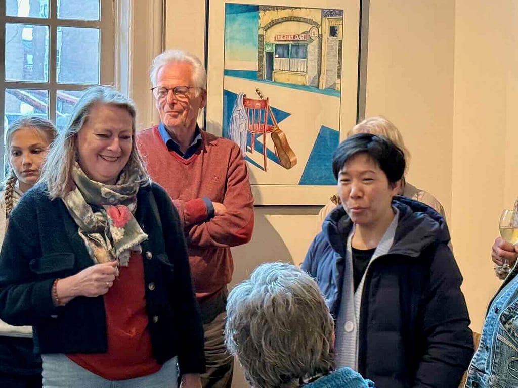 En zo zien we Sandra van het befaamde Chinese restaurant Woo Ping vertellen over haar grootvader, die in 1938 naar Nederland kwam. Waarna van lieverlee de hele familie naar Europa overkwam. Maar Sandra komt niet alleen, ze komt met schalen vol met hapjes die van verre komen. Voorwaar een smakelijke opening, passend bij het thema van de expositie. De vele aanwezige Mondialen genoten volop, niet alleen van de fraaie kunstwerken maar ook van de heerlijke hapjes.