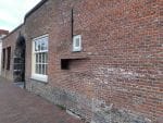 Tevens zien we helemaal hoog op de gevel de rode sleutels, het stadswapen van Leiden. De werf deed dienst als opslag voor hout en steen. Op de werf waren verschillende loodsen voor opslag en werkzaamheden. Achter het voorhuis was de smederij.