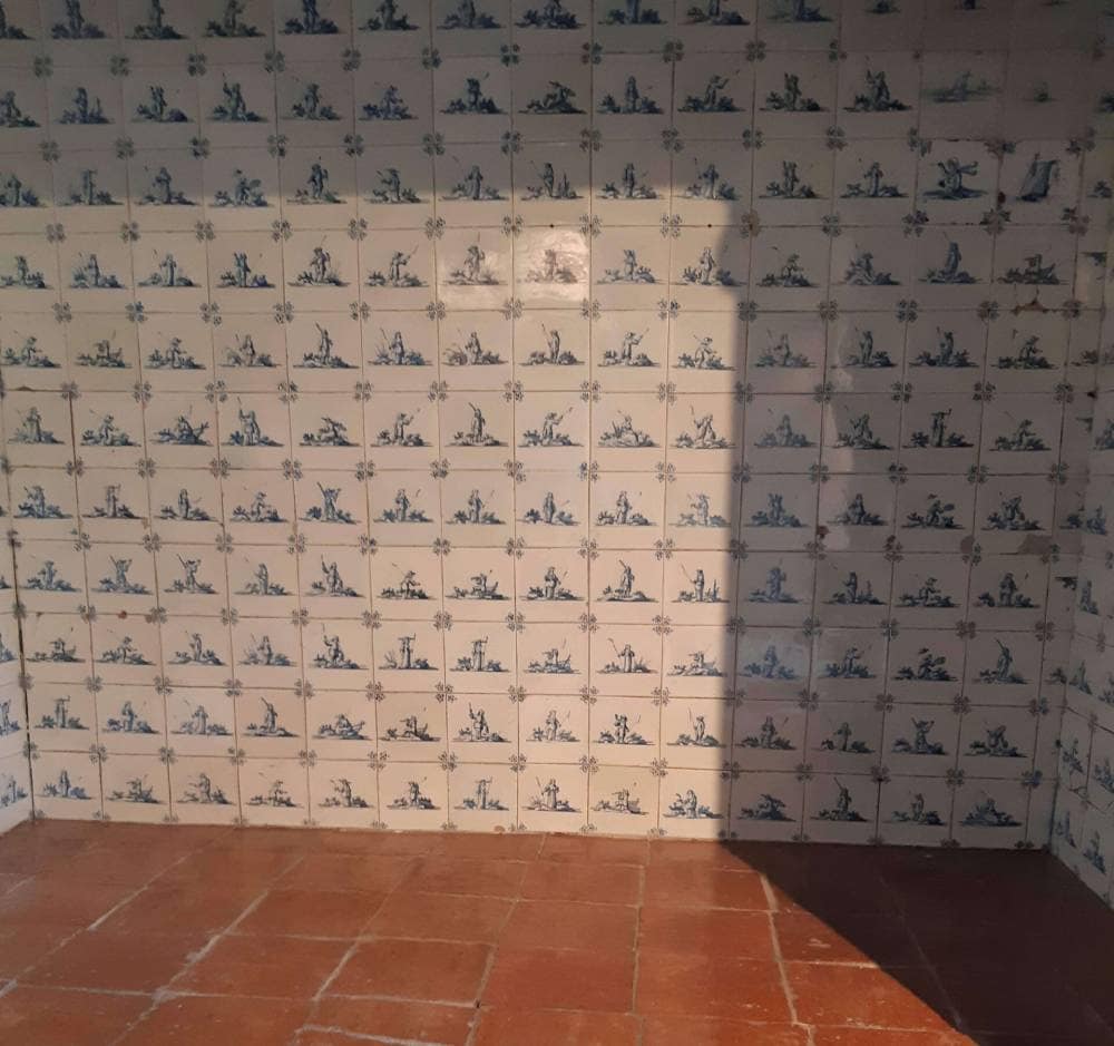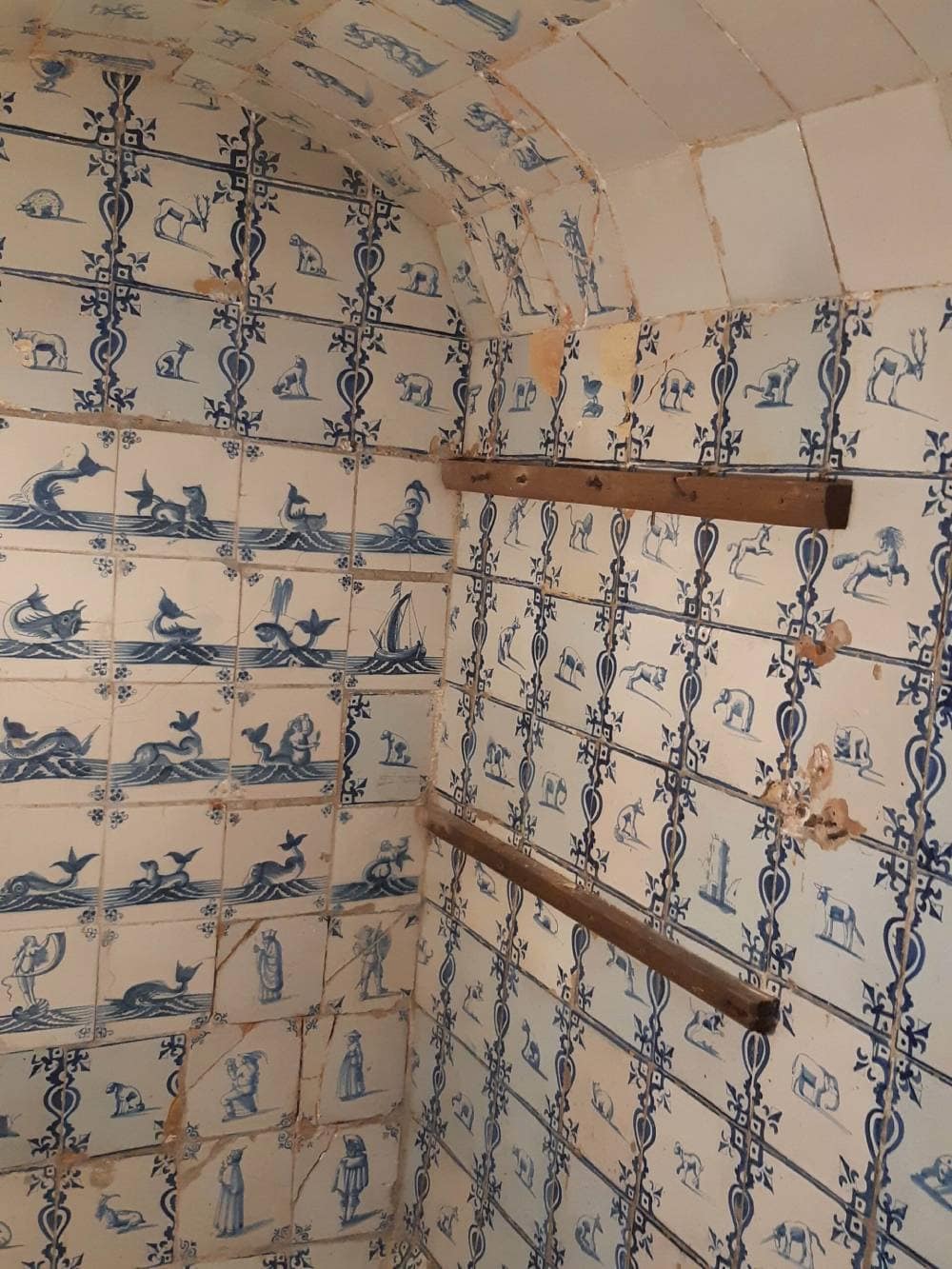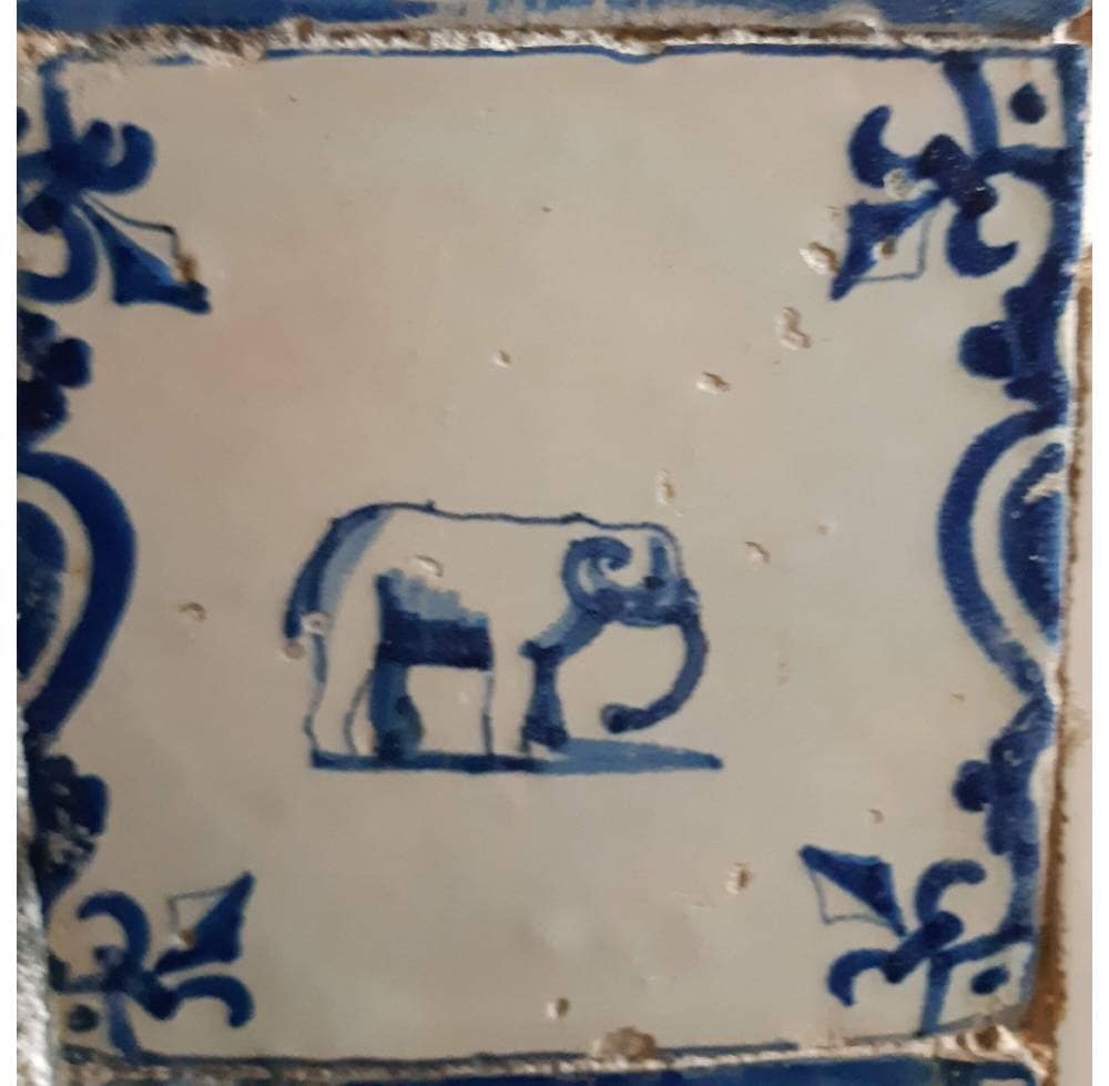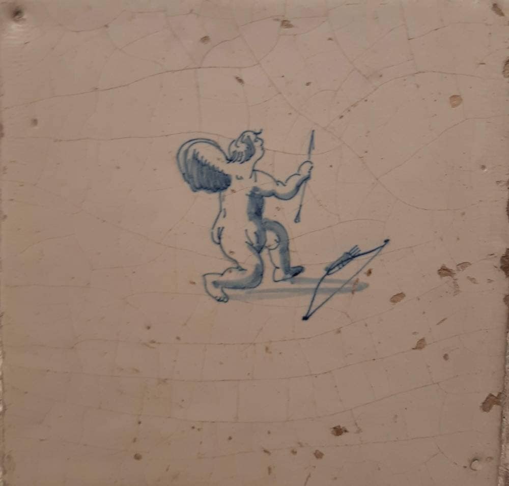 We zien in dit pand veel tegels. In de kelder zien we veel dierentegels en walvissen (zie stukje bij kelder) in de hal tegels met kinderspelen, wat verder in de gang tegels met soldaten te paard, in de opkamer in de bedstee herdertjes en achter de kast engeltjes of cherubijntjes. Omstreeks 1602 kwam door de handel met China blauwe porselein naar Holland. Dit was de inspiratie om in Nederland blauwe tegels te maken. Begin 1600 werden er in Nederland veel blauwe tegels geproduceerd. Men noemt ze Delfts Blauw maar er waren meer steden, zoals onder andere Rotterdam, Makkum, Harlingen, Leiden, waar ze werden vervaardigd. Historische tegels zijn te herkennen aan de kleine gaatjes op twee of meer hoeken. Dit is afkomstig van de houten mal waar ze door spijkertjes op hun plaats werden gehouden en waarna men het overtollige klei kon afsnijden. Er wordt momenteel onderzocht uit welke tijdsperioden de tegels komen.